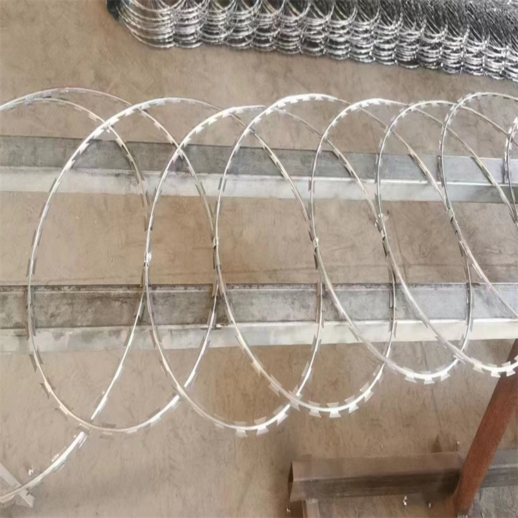 1. 螺旋型刀片刺絲,又稱為蛇腹網,分為兩種:單圈式刀片刺絲和螺旋型交叉式刀片刺絲。單圈式刀片刺網無須用夾子,按照其展開的自然形式進行安裝。而螺旋型交叉式刀片刺絲是在兩條刀片刺絲之間以不銹鋼片和鍍鋅鋼片強力夾和,展開后即成交叉狀,既美觀又實用。