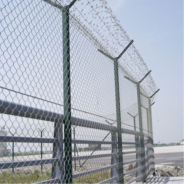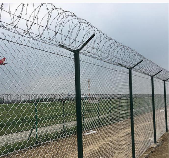 鋁包鋼機場圍界網是使用一種新型原材料鋁包鋼絲制作而成的機場圍界網產品,鋁包鋼絲是將鋼絲芯線外層包裹一層鋁作為外層防腐材料,它比傳統的PE或者PVC包塑鋼絲防腐性能更強,通常可以延長機場圍界產品使用壽命10-15年以上,適合于沿海空氣濕潤腐蝕性強的地區和環境較惡劣的沙漠邊緣地帶。鋁包鋼絲機場圍界網孔一般為50*50mm,絲徑5mm,頂部可搭配有V字叉和刀刺滾籠以加強防護能力。它還有一個優點就是鋁層是與鋼絲一起經機械拉拔到一起的,不易脫落。