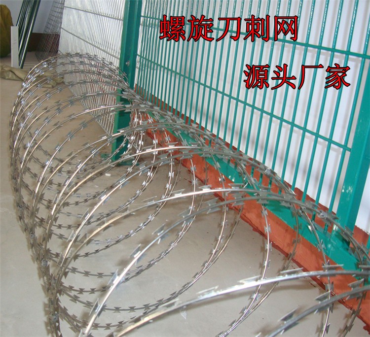 刀片刺繩是由熱鍍鋅鋼板或不銹鋼薄板沖壓出尖銳的刀片狀,高張力鍍鋅鋼絲或者不銹鋼絲做芯線組合而成的阻絕器材.常采用圍墻頂部V型支架,地面以上Y型鋼立柱架設。根據刀片刺繩圍欄的有效設計高度要求,可采用多道刀片刺繩圈配合橫向拉筋橫向架設,構成高密度立體的安全防護屏障。