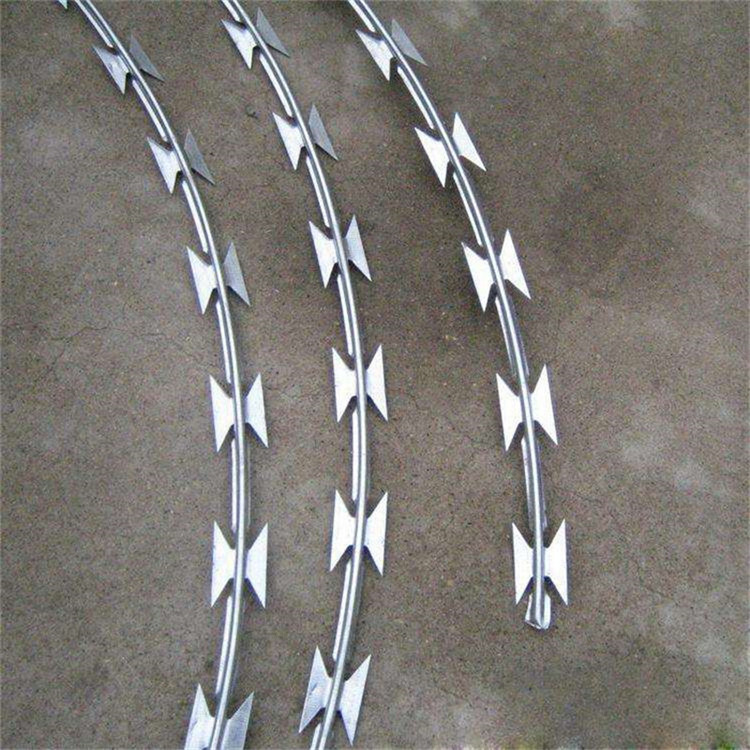 刀片刺網也稱刀片刺絲、刺絲滾籠、刺繩防護網,是一種新型護欄網產品。特點:阻嚇震懾效果好、美觀、施工便利,經濟實用,安全防護防爬等優異特點。