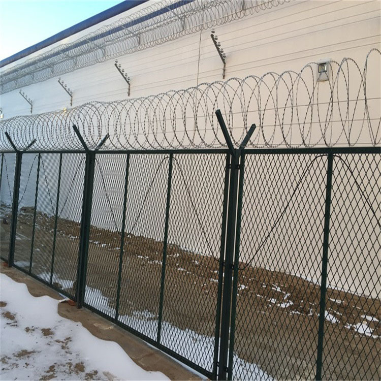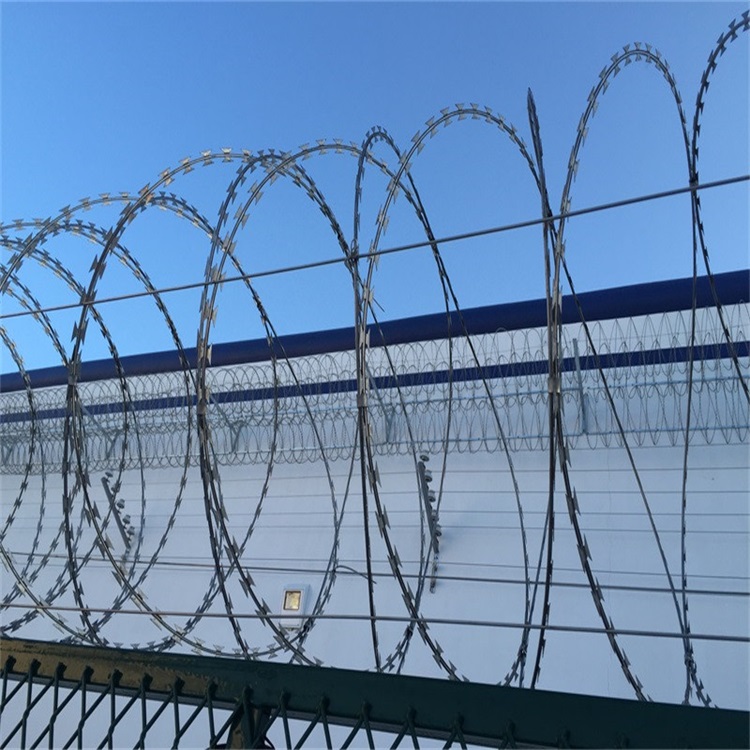 支架兩邊各拉兩根鋼絲,對刀刺網(wǎng)進行固定,以免左搖右晃。刀刺防護網(wǎng)的收放:刀刺防護網(wǎng)每2圈有3-7個卡扣,而且是圈圈相卡,拉開以后形成螺旋狀,拉伸的時候注意一定要帶防護手套,以免劃傷。拉開的時候只需要固定刺網(wǎng)的一邊,然后向相反方向拉開就行,注意孔的間距不要太大,不然起不到安全防護效果而且還影響美觀。收的時候只要慢慢的送回去就行,操作簡單,施工便利。