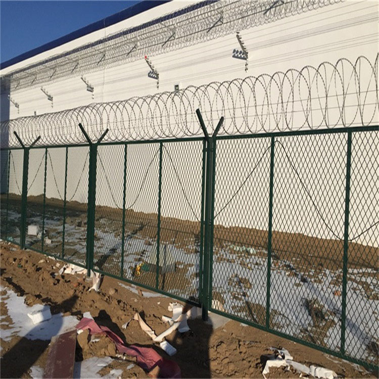 監獄鋼筋網圍墻是一種防護性能很強的隔離網,主要應用在監獄、看守所、核電站、軍事基地等對安全防護級別要求相對較高的場所。防翻越、防破壞能力都要比普通的金屬隔離網更高,網絲一般為優質低碳鋼絲或鍍鋅絲焊接而成,邊框一般為方管,立柱的頂部多數會焊接 V 型支架,再在頂部架設蛇腹型刀刺網,與下方的監獄隔離網完美結合,形成一道難以逾越的銅墻鐵壁。
