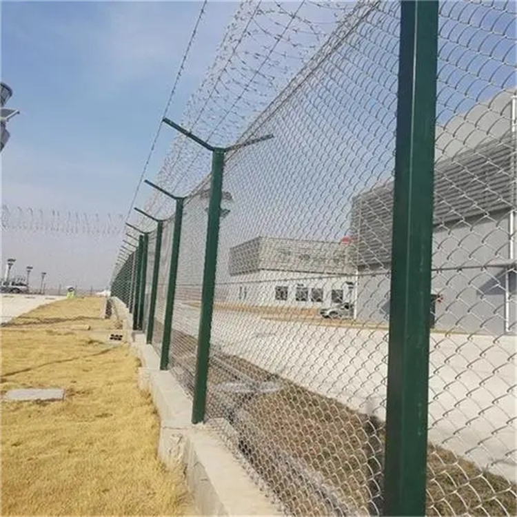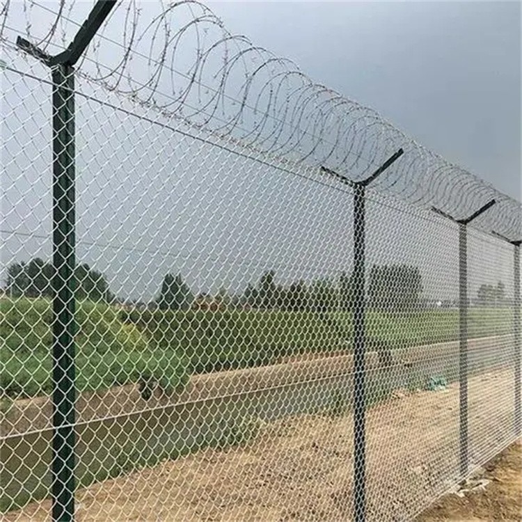 鋁包鋼絲機場圍界網是使用一種新型原材料鋁包鋼絲制作而成的機場圍界網產品,鋁包鋼絲是將鋼絲芯線外層包裹一層鋁作為外層防腐材料,通常可以延長機場圍界產品使用壽命10-15年以上,適合于沿海空氣濕潤腐蝕性強的地區和環境較惡劣的沙漠邊緣地帶。 頂部可搭配有V字叉和刀刺滾籠以加強防護能力。它還有一個優點就是鋁層是與鋼絲一起經機械拉拔到一起的,不易脫落。