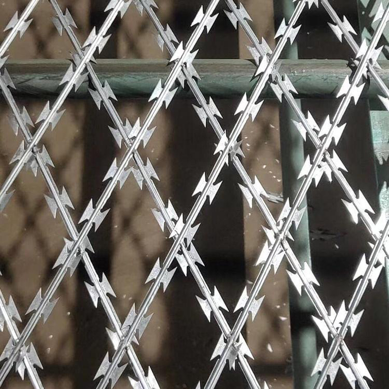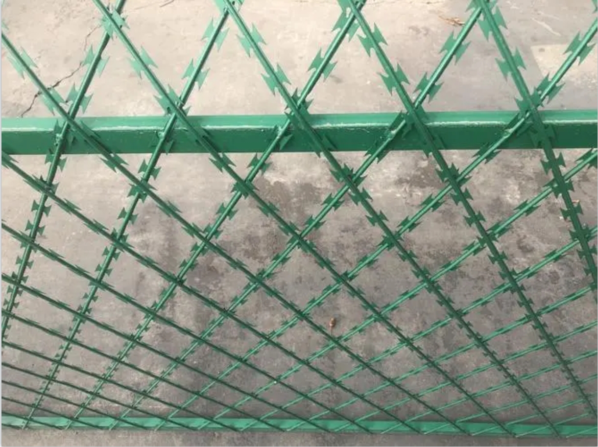 監(jiān)獄刀片鋼網(wǎng)墻是用直條的刀片刺繩直接焊接而成的網(wǎng)片,焊接成網(wǎng)片的刀片刺網(wǎng)擁有了小孔且不可攀爬的優(yōu)點(diǎn),同時(shí)在防護(hù)高度上改善了傳統(tǒng)的螺旋形刀片刺繩,焊接成片刺網(wǎng)尺寸可高達(dá)2米,長度不限,現(xiàn)在大部分監(jiān)獄,看守所,派出所,機(jī)場,重要廠區(qū)等改進(jìn)了原來的防護(hù)形式,越來越多的開始采用焊接式刀片刺網(wǎng)。