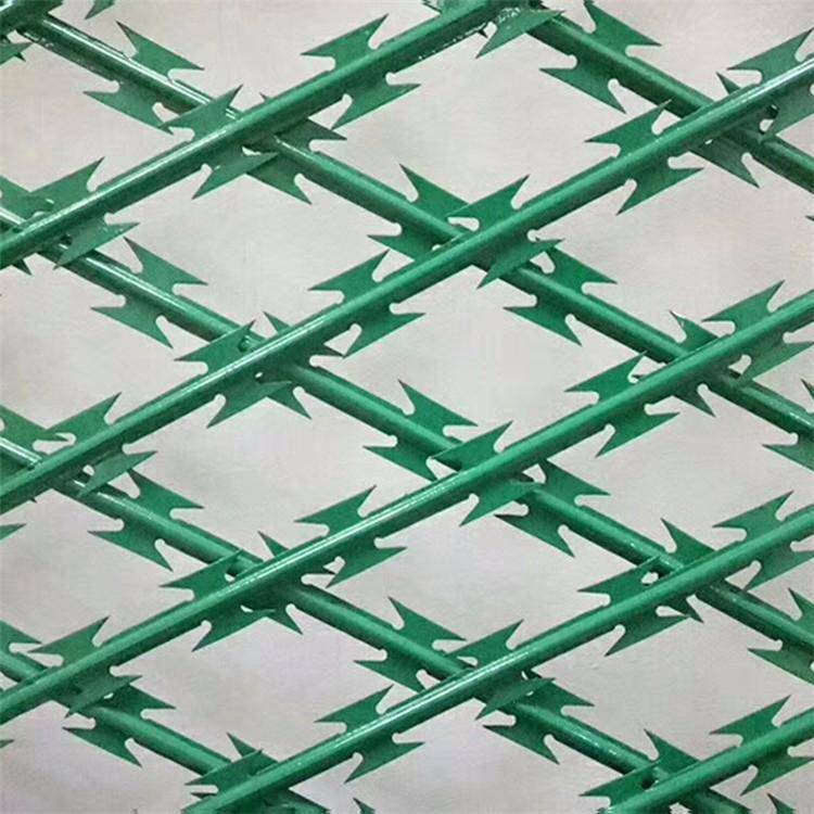 2、網(wǎng)片是蛇腹型刀剌繩由大型焊接自動(dòng)焊接而成,刀尖鋒利。為了保持這一特性,該網(wǎng)片只能噴塑。既保證了產(chǎn)品的鋒利程度又延長了它 的使用壽命。如果不想噴塑可以直接采用不銹鋼材質(zhì)。