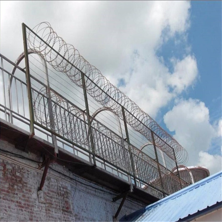 注:如果在監獄護欄網頂部加裝刀片刺絲、刀片刺繩后又很好的增強了安全防護性能。采用電鍍、熱鍍、噴塑、浸塑等防腐形式,具有很好的抗老化、抗曬、耐候等特點。其產品造型美觀、花色多樣,既起到圍欄作用,又起到美化作用。由于具有安全性高、防攀爬能力好,網片連接方式采用特制SBS緊扣件,有效防止人為的破壞性拆卸,橫向四道折彎加強筋,使網面強度顯著增加。