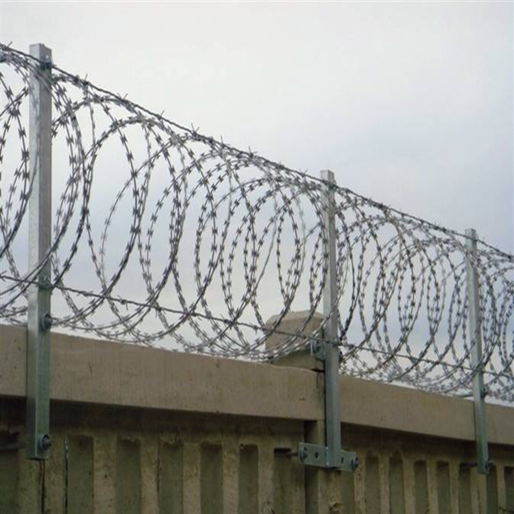 高鐵刺絲滾籠是沖剪鋼板成銳利的尖刀帶子,然后包裹中碳鋼絲(筋絲)之上。刀片刺絲是從海外引進(jìn)的絕對(duì)禁止通過的新型隔離產(chǎn)品。鋒利的刀片刺絲由雙根線扣卡子組裝后成蛇腹?fàn)睿屓丝吹讲缓冢軌蚱鸬搅丝謬樧饔茫瑢?shí)際上人挨上刀片刺絲就被劃破,實(shí)際效果明顯。該產(chǎn)品施工便利快捷。深受軍隊(duì)和警察喜好。各國已將刀片刺網(wǎng)廣泛用于飛機(jī)場(chǎng)、軍事重地、邊境線、監(jiān)獄、政府機(jī)關(guān)、銀行,以及別墅的圍墻、高速公路、鐵路護(hù)欄等地。
