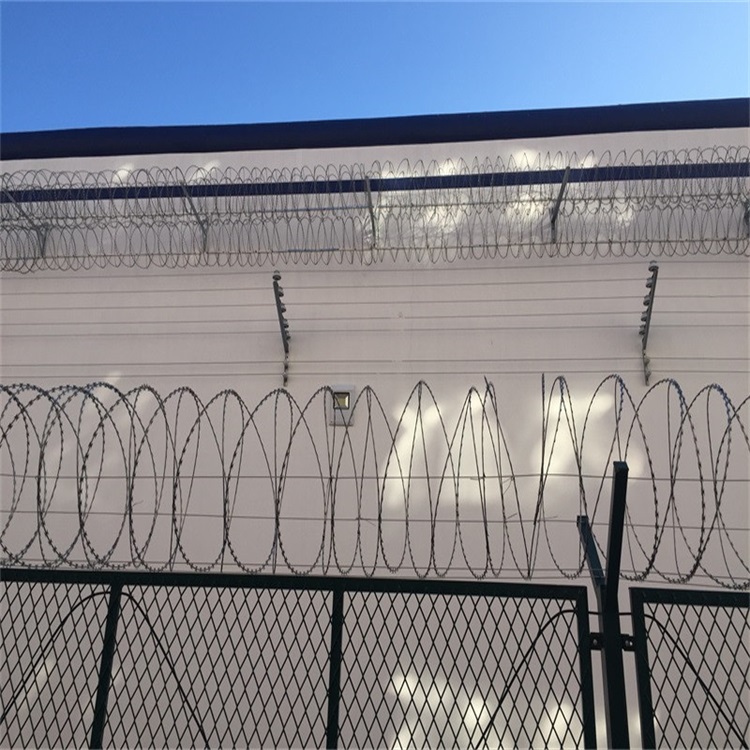 監(jiān)獄鋼網(wǎng)墻采用高強(qiáng)度的刀片刺網(wǎng)與普通防護(hù)網(wǎng)的結(jié)合,由V型支架立拄,加強(qiáng)型焊接片網(wǎng),安全防盜連接件和組成。監(jiān)獄鋼網(wǎng)墻網(wǎng)格結(jié)構(gòu)簡練、便于運(yùn)輸、安裝不受地形起伏限制,特別是對(duì)于山地、坡地、多彎地帶適應(yīng)性極強(qiáng)。螺旋型交叉刀片刺網(wǎng)是在兩條刀片刺網(wǎng)之間以不銹鋼片和鍍鋅鋼片強(qiáng)力夾扣,展開后即呈交叉狀,美觀又實(shí)用。