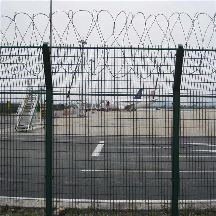 飛機場圍界隔離網也叫機場鋼筋網圍界,鋼絲網圍界機場鋼筋網圍界是一種高安全隔離防護網,從用料到表面處理到運輸再到安裝要求都非常的嚴格。.這種新型隔離網一般由鋼筋焊接網、Y型防護立柱以及蛇腹式刀刺網等幾大主體組成。既有良好的通透性,又能起到強有力的安全隔離防護效果,頂部加裝刀刺網,同時起到了美觀大方的作用,與周圍環境以及任何景觀、設備都能完美相融合,因此機場鋼筋網圍界常被大量應用于機場隔離,監獄防護、軍事基地等特殊地帶的安全防護。