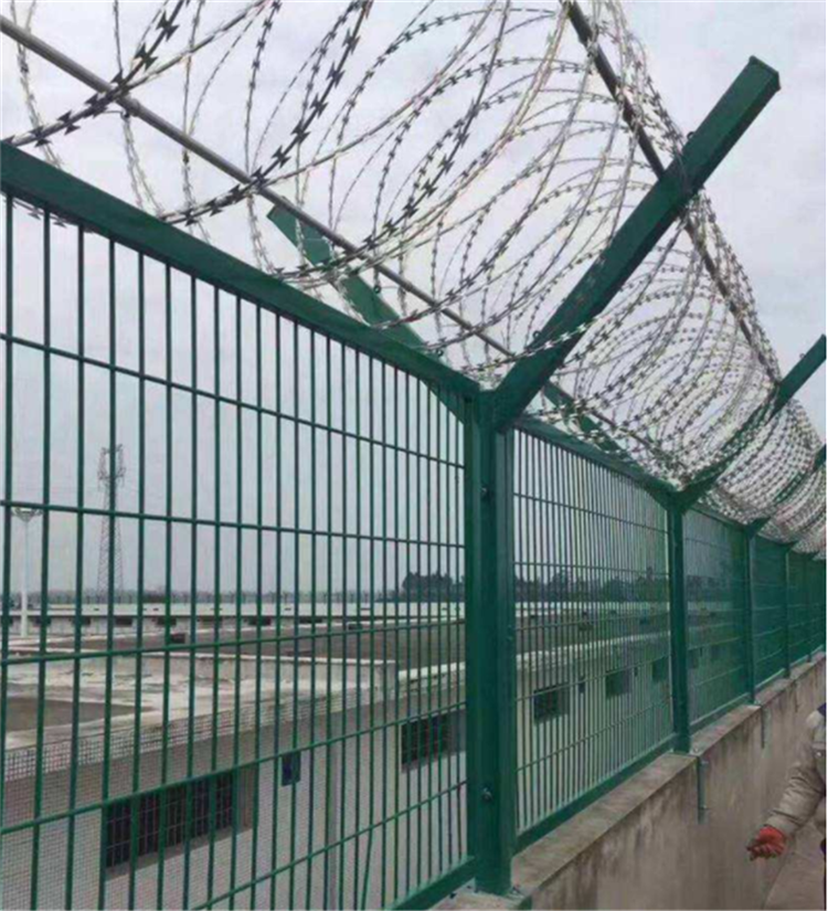 監獄護欄網又稱作“Y型安全防御護網”,是由V型支架立柱,加強型焊接片網,安全防盜連接件和熱鍍鋅刀片刺籠組成強度和安全防御性級別很高。