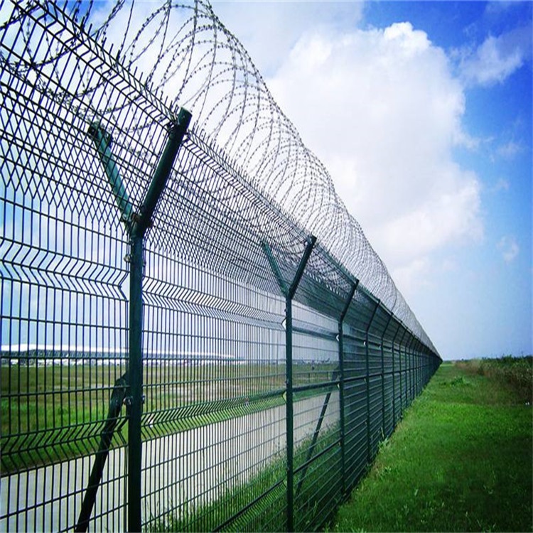 機(jī)場(chǎng)圍界又稱作“Y型安全防御護(hù)網(wǎng)”,是由V型支架立柱,加強(qiáng)型焊接片網(wǎng),安全防盜連接件和熱鍍鋅刀片刺網(wǎng)組成強(qiáng)度和安全防御性級(jí)別很高。近年來,被廣泛應(yīng)用在機(jī)場(chǎng)等高安全場(chǎng)所。