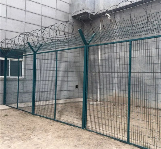 1、浸塑制作流程,將工件進行去除氧化層--水洗--將工件加熱至380攝氏度高溫--將加熱好的工件放入固體粉末槽,粉末經過高溫粘附在監獄隔離網的表面,然后進入烘烤固化室--成品。優點:色彩鮮艷,不易老化,顏色多種選擇,防腐壽命10年以上, 缺點:時間久