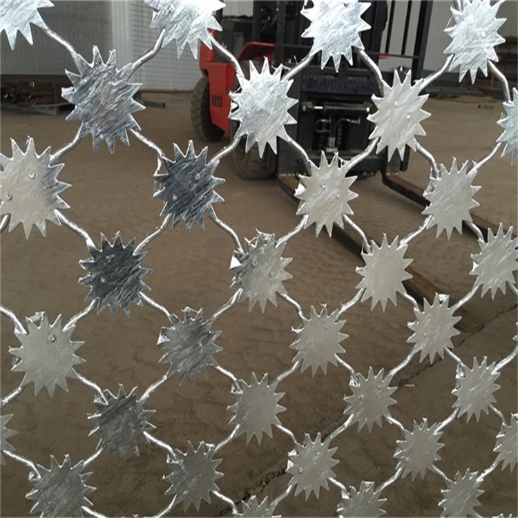 美格網(wǎng)片:網(wǎng)片為菱形網(wǎng)孔,網(wǎng)格尺寸:120mm*110mm(高*寬),網(wǎng)絲直徑8mm,采用S195線材高壓焊接,每一個焊點附焊梅花刺一個。梅花刺片:梅花刺片直徑不小于7.5cm(直徑6cm、7cm、8cm),刺片厚1.5mm,采用Q235低碳鋼板沖壓成型。梅花刺片用氬弧焊將梅花形刺片焊接在美格網(wǎng)的節(jié)點上。