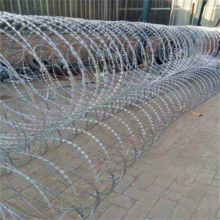 刀片刺網又名刮刀型刺絲、蛇腹網、刮刀型刺網刀片。刺網的材質是選用低碳鋼絲、鋁鎂合金絲,噴塑,編焊而成。刀片采用nai腐蝕性的熱鍍鋅鋼板或不銹鋼板為材料,采用專用機械強力包附在熱鍍鋅高碳鋼絲或不銹鋼絲做的芯線上。是一種發展起來的防護、隔離能力較強的新型防護網產品。鋒利的刀型刺由雙線扣裝后成蛇腹狀,既美觀又讓人不寒而栗。起到了很好的阻嚇作用。同時該產品具有美觀、防阻效果好、施工便利等優點。
