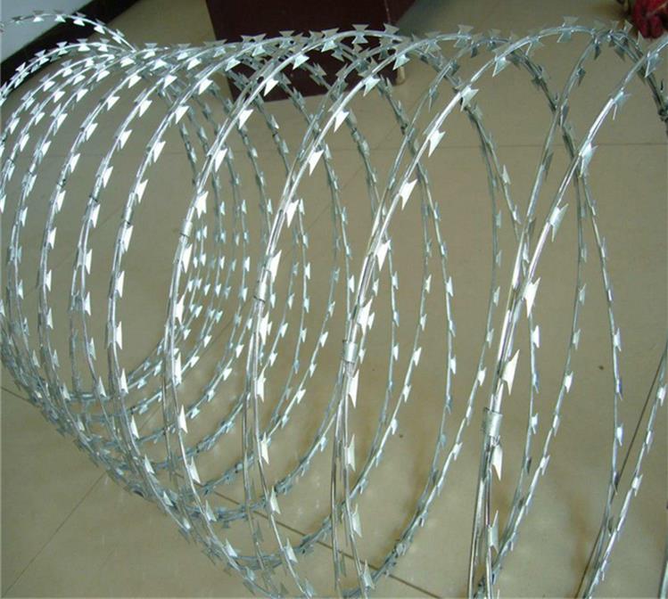 它采用鋼板沖壓成型包附于鋼絲(筋絲)之上,由銳利尖角鍍鋅鋼板或不銹鋼薄板做刀片,高張力鋼絲做芯線組合而成的。鋒利的刀型刺由雙線扣裝后成蛇腹狀,既美觀又讓人不寒而栗。