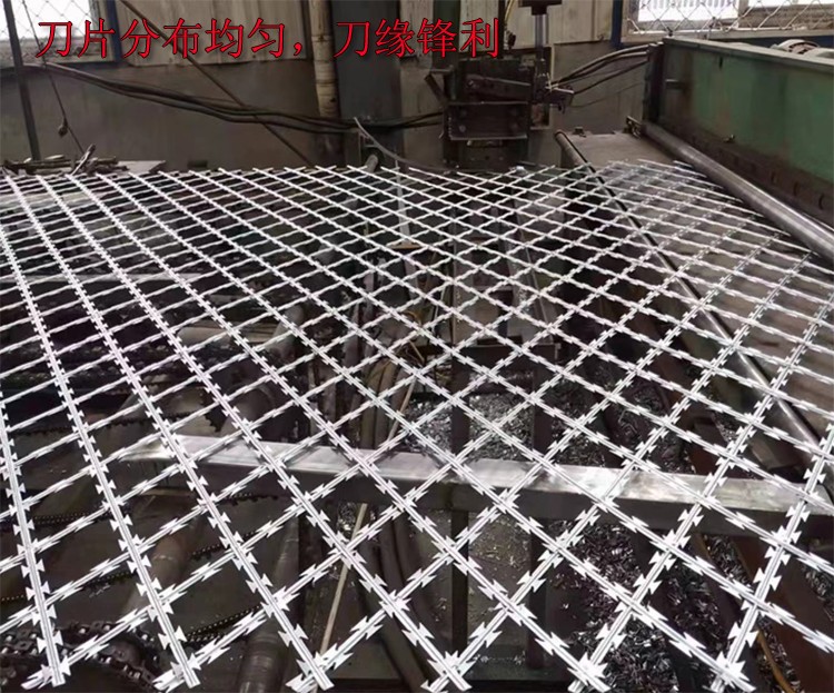 焊接刀片刺網(wǎng)是用直條的刀片刺繩直接焊接而成的網(wǎng)片,焊接成網(wǎng)片的刀片刺網(wǎng)網(wǎng)孔較小且擁有鋒利的刀片,難以逾越,并且改變了螺旋刀刺網(wǎng)的高度問題。