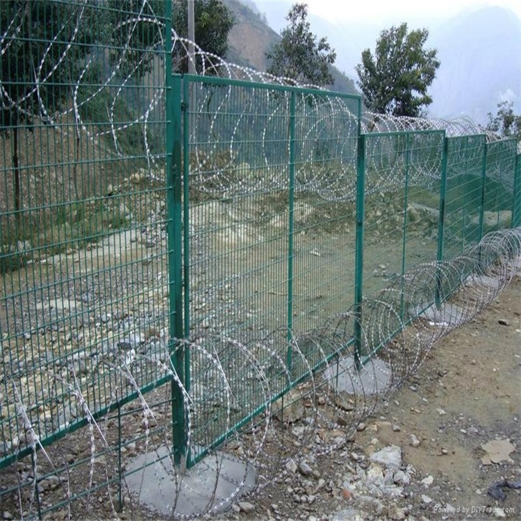刀刺網(wǎng)有螺旋式刀片刺網(wǎng),交叉式刀片刺網(wǎng),平板式刀片刺網(wǎng),刺絲滾籠等多種稱呼。主要用干軍方車地,監(jiān)獄,銀行。以及生活小區(qū)圍墻、私人住宅、別墅的圍墻、門窗、高速公路、鐵路護(hù)欄以及邊境線等用來(lái)防護(hù)保安。刀片刺網(wǎng)又名刮刀型刺絲,是一種新發(fā)展起來(lái)的防護(hù),隔離能力較強(qiáng)的新型防護(hù)網(wǎng)產(chǎn)品。鋒利的刀型刺由雙線扣裝后成蛇腹?fàn)睿让烙^又讓人不賽而栗。起到了很好的阻嚇作用。同時(shí)該產(chǎn)品具有美觀,運(yùn)輸方便,施工便利等優(yōu)點(diǎn)。刀片刺繩一般用于監(jiān)獄做防護(hù)用,因刀片鋒利不易觸摸,讓人望而聲畏,起到很好的防護(hù)效果。同時(shí)價(jià)格也不高,所以刀片刺繩越來(lái)越應(yīng)用廣泛。中國(guó)監(jiān)獄基本上用的都是刀片刺網(wǎng)。它采用鋼板(刀板)沖壓成型包附于熱鍍鋅鋼絲(芯線)之上,由銳利尖角鍍鋅鋼板或不銹鋼薄板做刀片,高張力鋼絲做芯線組合而成的。