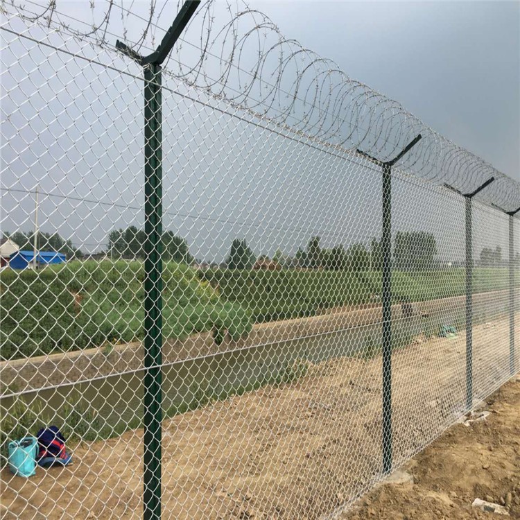 機場鋁包鋼勾花護欄網絲線具有強度較高,防腐蝕性能較好,電工性能優干鍍鋅鋼絲等優點,由于鋁層厚度和鋼絲強度的組合選擇很多,具有很大的設計靈活性。新型機場圍界網采用了鋁包鋼護欄網,也可用于監獄,公路,鐵路,工業區,運動場等不同的場所。