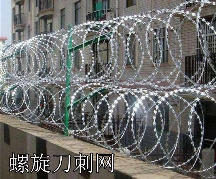 刀片刺網是一種近年發展起來的防護,隔離能力較強的安全防護網產品,鋒利的刀型刺由雙線扣裝后成蛇腹狀,既美觀又讓人不寒而栗,使人望而卻步。因刀片鋒利不易觸摸,手不能握,只要輕輕一碰就會劃傷,腳也不能爬,大大提高了監獄的防護效果。