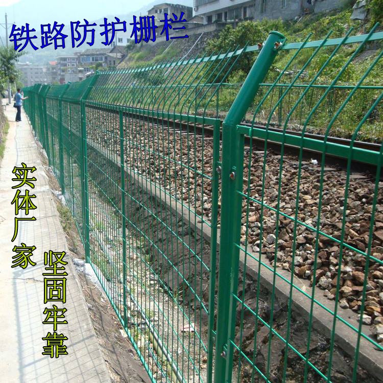 鐵路防護網的類型大致分為:直框護欄,頂部30°折彎的護欄,一般鐵路線路兩側為了陰止落石或者阻擋外界的仟何動物的時候會選擇雙邊絲護欄網作為隔離網。鐵路鐵軌兩側會使用直框護欄或者加折彎的護欄作為防護網,安裝尺寸:1.8米*3米,柱中到柱中,鐵路線路上常采用水泥立柱與網片連接。邊框:30*50mm方管,表面處理:浸塑草綠色或者浸塑墨綠色。