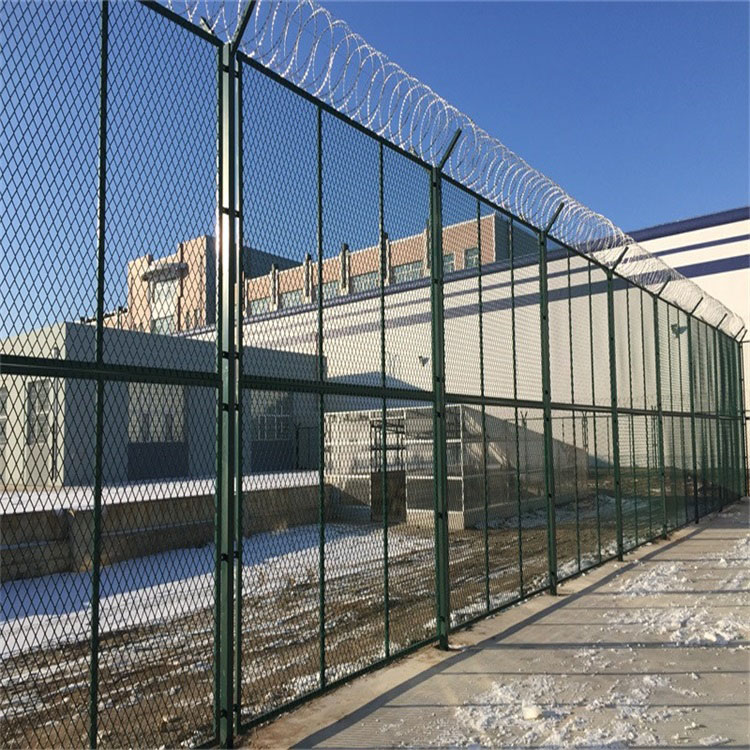監獄圍墻加裝隔離網是V型支架立柱.加強型焊接片網,安全防盜連接件和熱鍍鋅刀片刺籠組成,強度和安全防御性級別很高。在監獄圍墻加裝隔離網頂部加裝刀片刺絲刀片刺網又名刮刀型刺絲,刀片刺網又名刮刀型刺絲,是一種發展起來的防護、隔離能力較強的新型隔離網產品。監獄通過對罪犯執行刑罰,剝奪其人身自由,使他們與社會隔離,失去再犯罪的條件,以防止服刑期間重新違法犯罪,監獄看守所鋒利的刀型刺由雙線扣裝后成蛇腹狀,像一條帶刺的大蛇,既美觀又讓人不寒而栗。起到了很好的阻嚇作用。