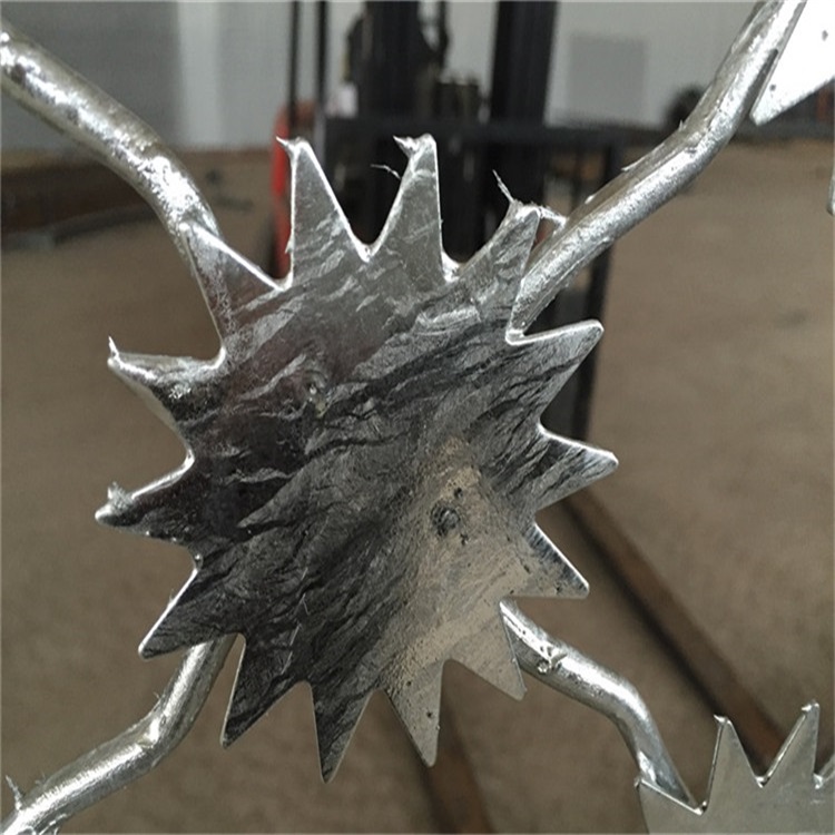監獄太陽花刺片鋼網墻也叫梅花刺片隔離網墻,整體架構由美格網+梅花刺片、邊框、立柱、刀刺網組成。其立柱采用Y型鍍鋅鋼管制作而成,常用圓管Φ114mm*3.0 以上,也可以用80*80、100*100mm 方管。網片邊框的尺寸為60*60*2.5m、方管 40*40*1.5mm 及以上規格,角鋼 50*5mm。網孔:110*110mm,100*100mm,絲徑:6.0mm,5.0mm,刺片:直徑 75mm,厚度 1.2mm,14 個刺。除此之外,監獄防攀爬護欄網的Y型立柱上面還安裝了不銹鋼刀片刺網,并且表面采用噴涂工藝,常見的有墨綠色噴涂和銀灰色噴涂,既起到防腐防銹的作用,又能起到裝飾環境的效果,美觀大方!