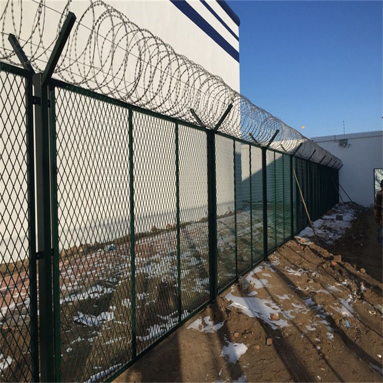 監(jiān)獄護欄網(wǎng)又稱作“Y型安全防御護網(wǎng)”和機場護欄網(wǎng)通用,是由V型支架立柱,加強型焊接片網(wǎng),安全防盜連接件和熱鍍鋅刀片刺籠組成強度和安全防御性級別很高。監(jiān)獄護欄網(wǎng)可平地安裝,也可在圍墻上二次安裝,有效防止攀逃。直刺式刺網(wǎng)隔離帶,是用柱體和普通刺繩橫、縱、斜向交叉綁定成刺網(wǎng)隔離帶。監(jiān)獄護欄網(wǎng)主要用于特殊地帶、軍事基地圈護、溝壕圈護,安裝簡易。